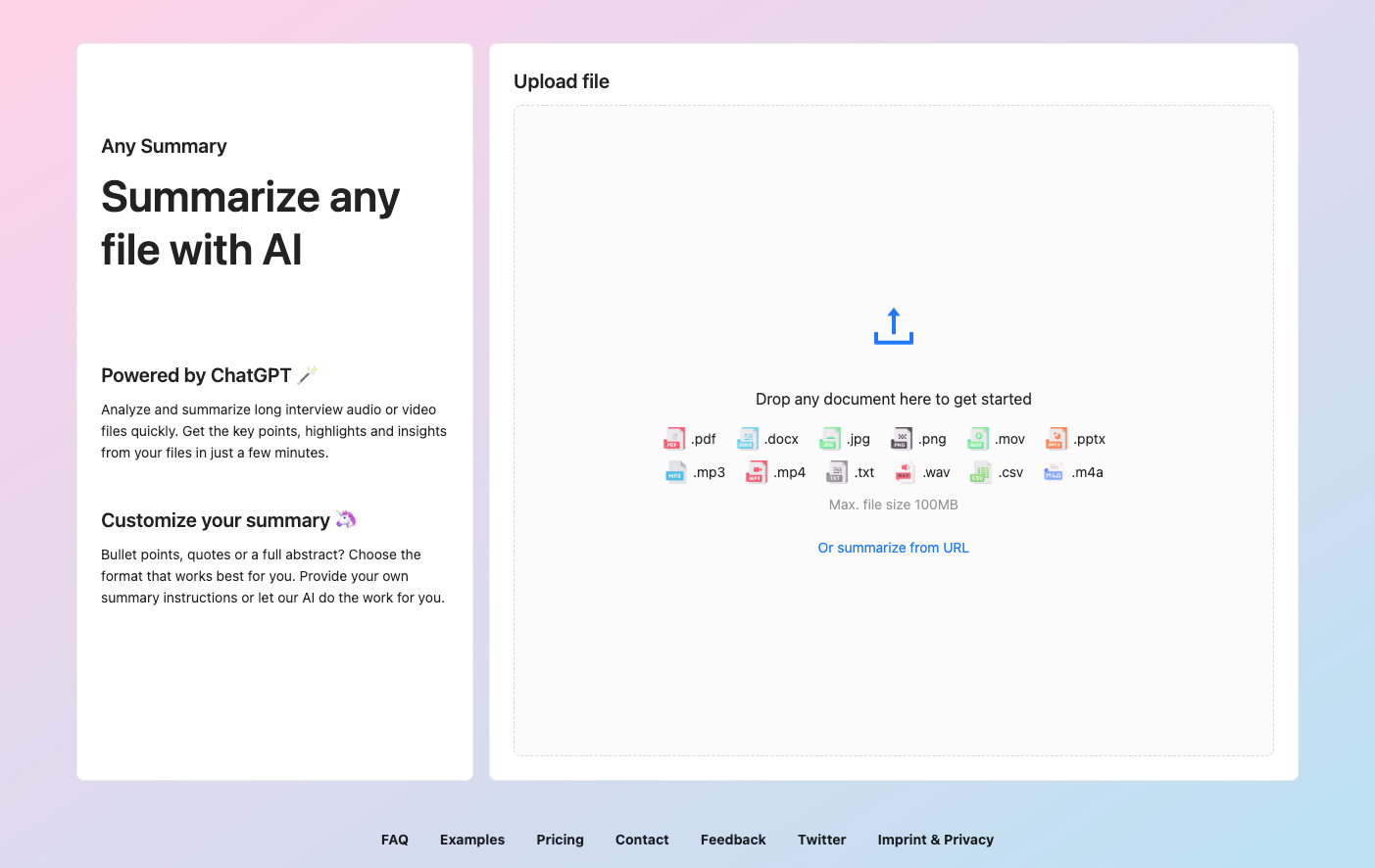 Any Summaryは、PDF、DOC、TXT、CSV、PPTなどのテキストファイルや、JPG、PNGなどの画像ファイル、MOV、MP3、MP4などのオーディオビデオファイルを読み取って、内容を要約してくれます。