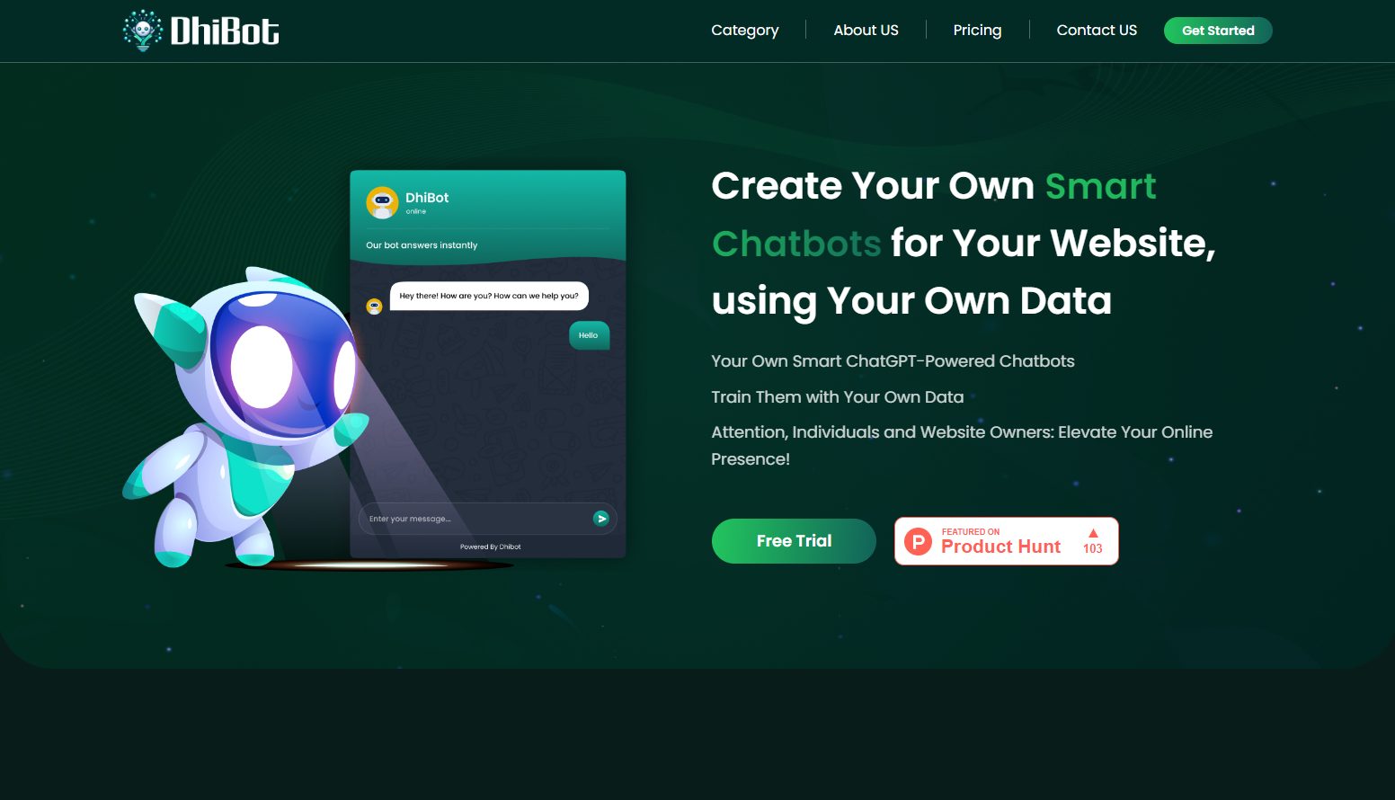 メインコピー:Create Your Own Smart Chatbots for Your Website, using Your Own Data(あなたのウェブサイト用に、あなたのデータを使用して独自のスマートチャットボットを作成する)