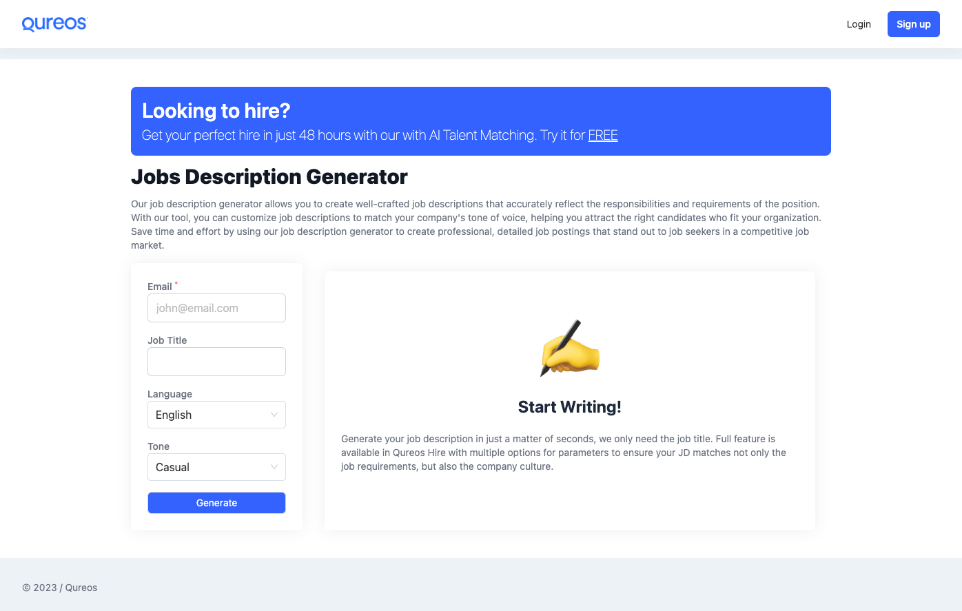 Qureosは、ポジションの責任と要件を正確に反映した、よく練られたジョブディスクリプションを作成するのに役立つジョブディスクリプションジェネレーターです。Qureosを使えば、会社の声のトーンに合わせて職務経歴書をカスタマイズすることができ、組織に合った適切な候補者を引きつけるのに役立ちます。