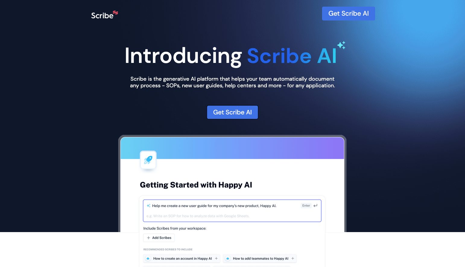Scribe is the generative AI platform that helps your team automatically document any process – SOPs, new user guides, help centers and more – for any application.(Scribeは、SOP、新規ユーザーガイド、ヘルプセンターなど、あらゆるアプリケーションのプロセスを自動的に文書化するための生成的AIプラットフォームです。)