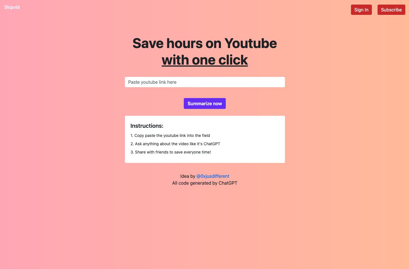 Skipvid AIツール紹介 2025.10.29 目次 キャッチコピー概要説明 キャッチコピー Save hours on Youtube with one click(ワンクリックでYoutubeの時間を短縮) 概要説明 Skipvidは、YouTubeの動画を簡単に要約することができるAIツールです。このツールを使えば、YouTubeのリンクをコピー&ペーストするだけで、動画の要約が簡単に作成できます。 (Perplexityで生成) Skipvidのサイトを見る