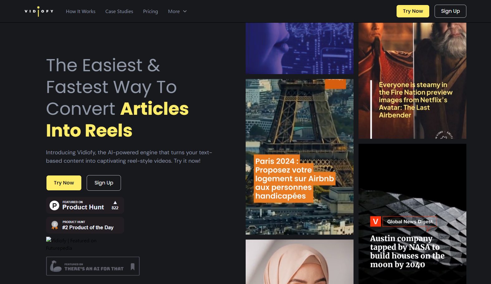 説明:Vidiofy is a generative AI tool that helps brands and publishers convert text-based content into mobile first, vertical, short form videos for social media.(Vidiofyは、ブランドや出版社がテキストベースのコンテンツをモバイルファーストの縦型、短編のソーシャルメディア用ビデオに変換するのを助ける生成AIツールです。)