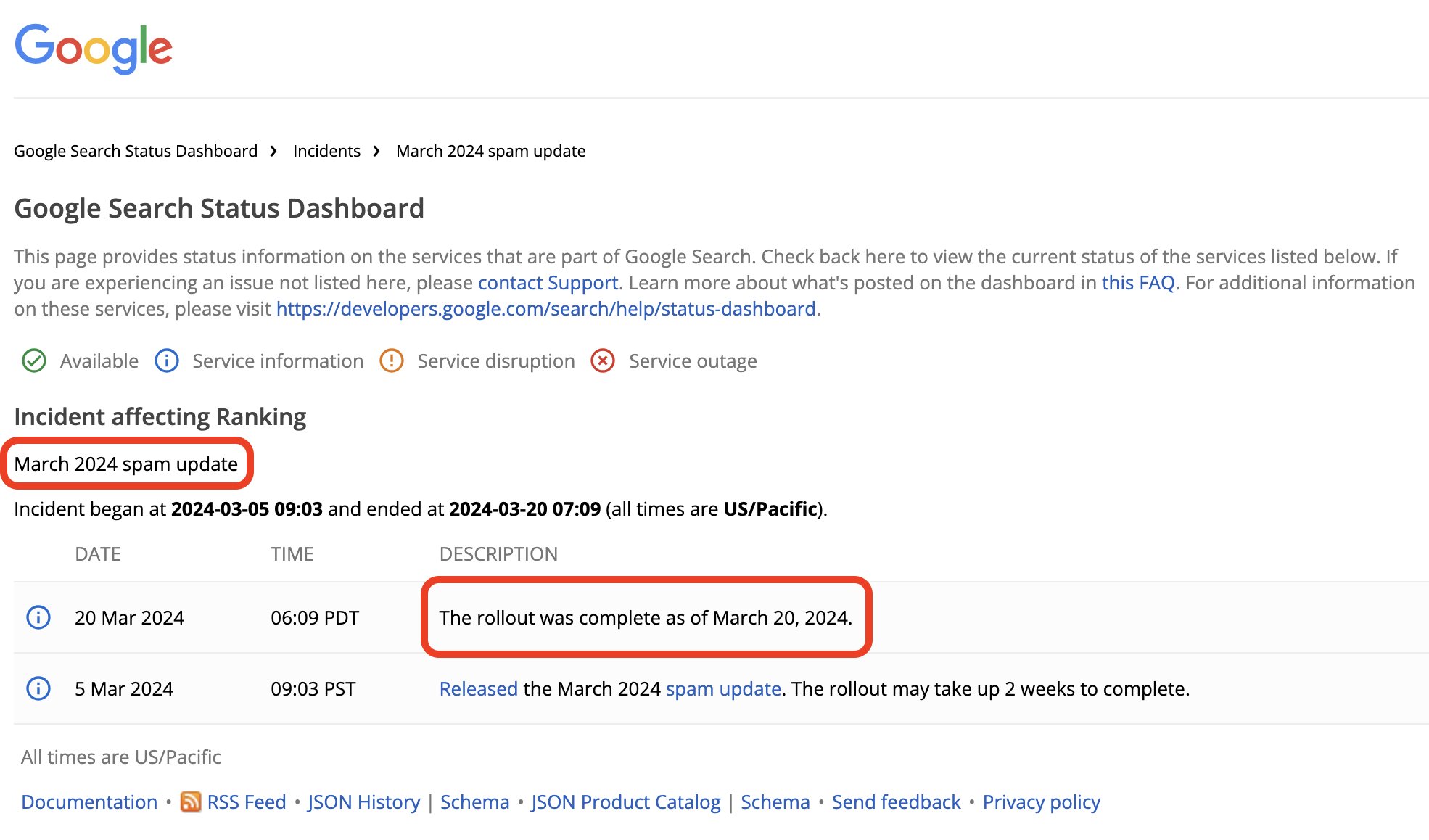 2024年3月5日に開始されたコアアップデート&スパムアップデートですが、Google Search Status Dashboardを確認したところ、3月20日にスパムアップデートが完了したようです。ちなみにコアアップデートはまだ継続中です。全て完了するまで約一ヶ月かかる見通しとのことなので、4月上旬に完了すると思われます。