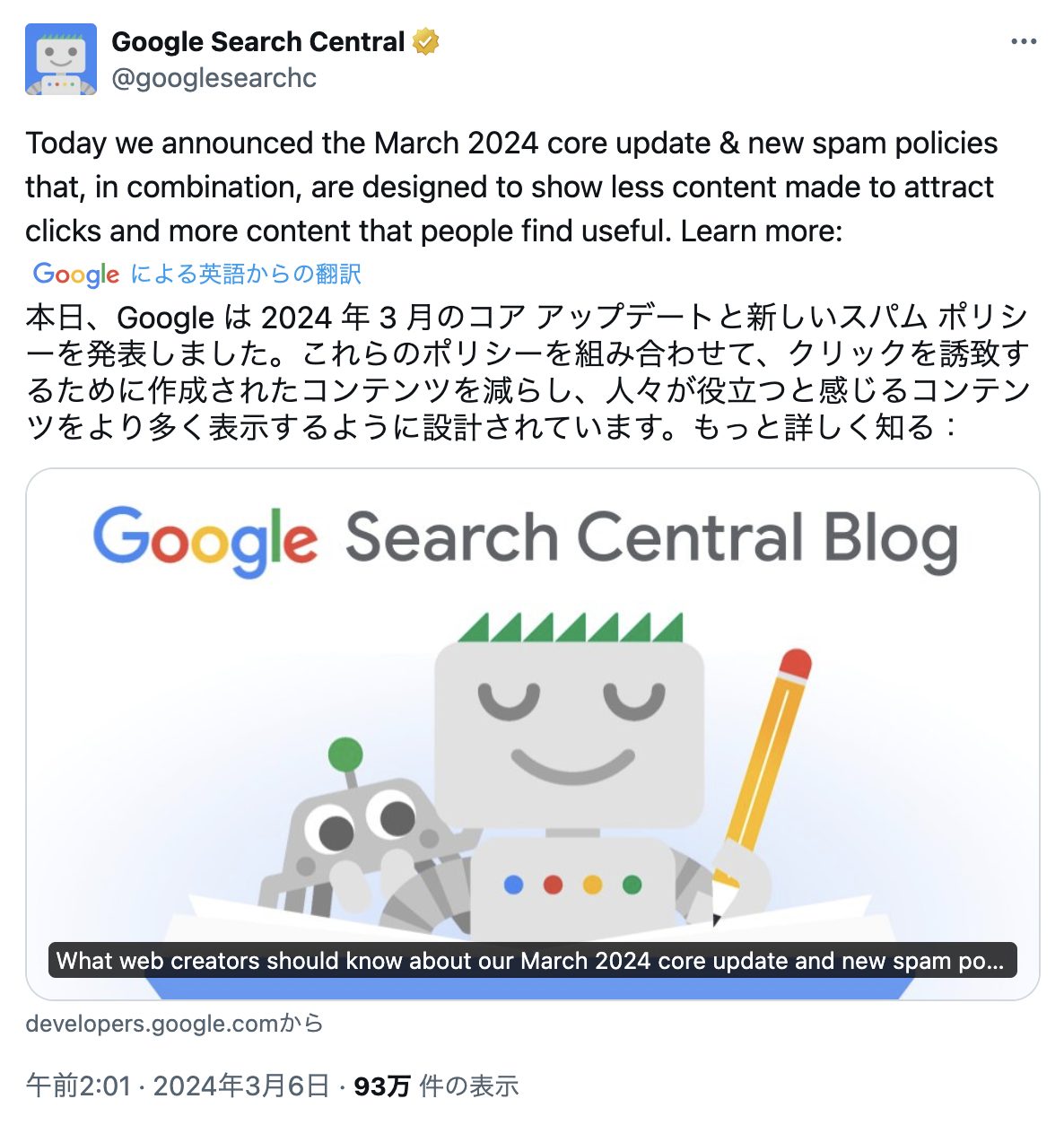 Google社が 2024年3月コアアップデート / スパムアップデートの開始を発表