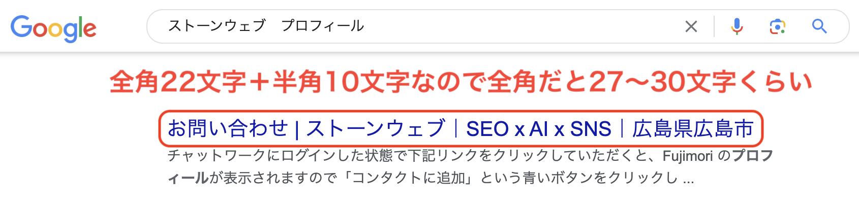 検索結果で表示されるタイトルは約30文字までとなっています。30文字を超えると文字化けして表示されない可能性があるため、重要な部分を30文字以内に収める必要があります。