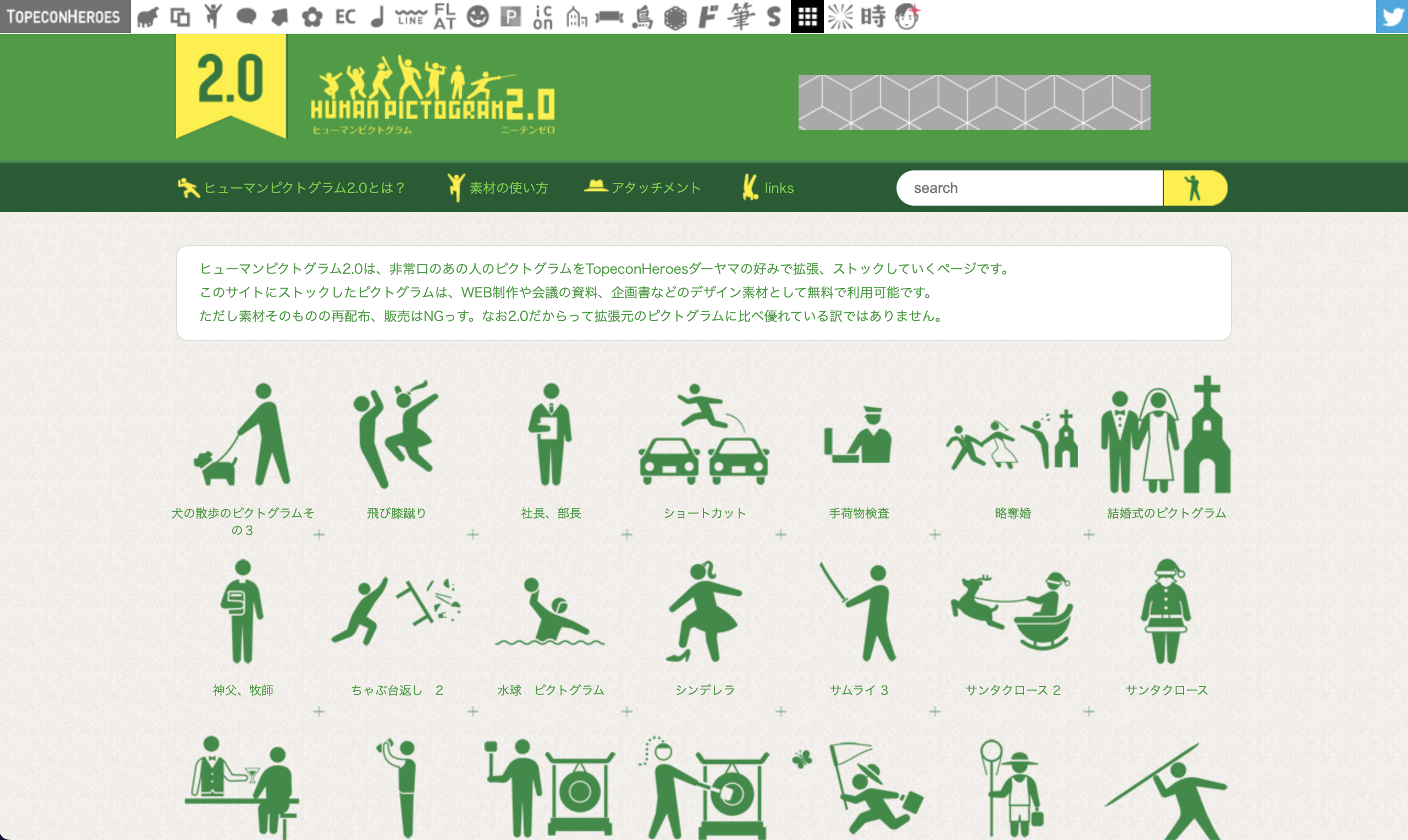 デザイナーのダーヤマさんが運営する素材サイトで、非常口マークの棒人間をさまざまなシチュエーションでピクトグラム化しています。ピクトグラム素材は、ビジネス、職業、公共、スポーツ、感情、女性、面白系、その他の8つに分類されていて、四股を踏む相撲取り、直滑降で滑る人、座って新聞を読むおじさん、ルームランナー茶道など、面白いネーミングとシチュエーションの素材が盛り沢山です。